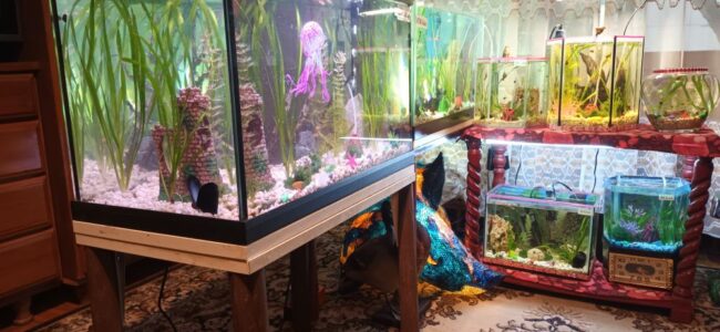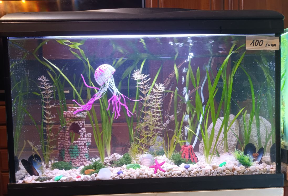 Akvarij kompletno uređen sa ribicama, 10 puževa čistača, živo bilje, pumpa za zrak sa vulkanom. Još ima akvarijski pijesak, školjke, prodajem za 50 eura. Imam kuglu za 30 eura i veći za 50, 60 i  100 eura. Šaljem slike i video.  Novi Zagreb Utrina,  091/9240-293