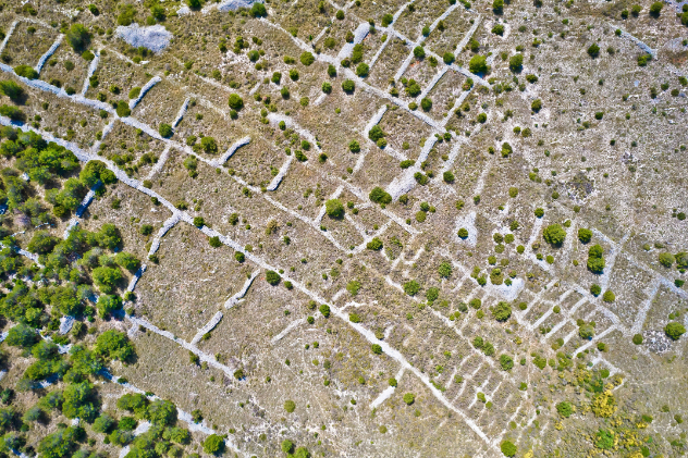 U Dalmaciji je situacija obrnuta. Prosječan posjed ovdje rijetko prelazi 2 do 3 hektara, a u mnogim je otočnim i priobalnim općinama i manji. Krš, suhozidi i brdovit teren onemogućuju stvaranje velikih neprekinutih površina, a poljoprivreda je fokusirana na trajne nasade poput maslina, vinove loze i smokava. Zbog povijesnog nasljeđivanja i iseljavanja, jedna čestica često ima desetke suvlasnika, što gotovo u potpunosti zaustavlja tržište zemljišta i okrupnjavanje.