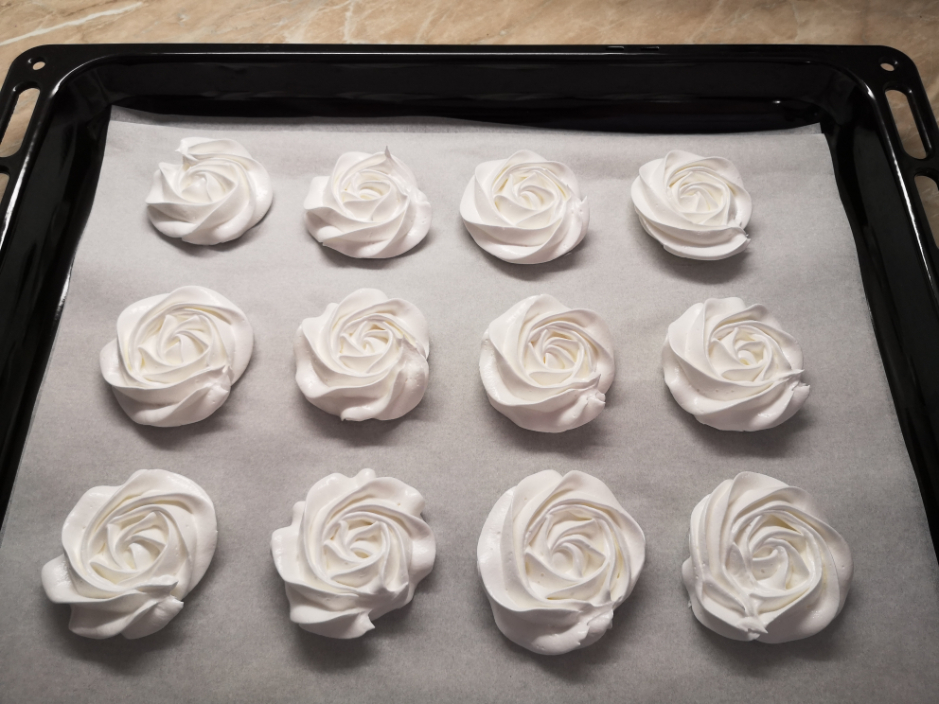 Priprema: Bjelanjke s prstohvatom soli izraditi u čvrsti snijeg. Postupno dodavati šećer i miksati, sve dok se šećer u potpunosti ne otopi, da ne bude grudica. U lim od pećnice staviti papir za pečenje. Napuniti vrećicu za dekoriranje s beze smjesom te na papiru za pečenje smjesom formirati krugove u obliku ruža, promjera oko 6 cm. Sušiti u zagrijanoj pećnici na 100 °C, 90 minuta. Ugasiti pećnicu i ostaviti ih unutra da se ohlade zajedno s pećnicom.