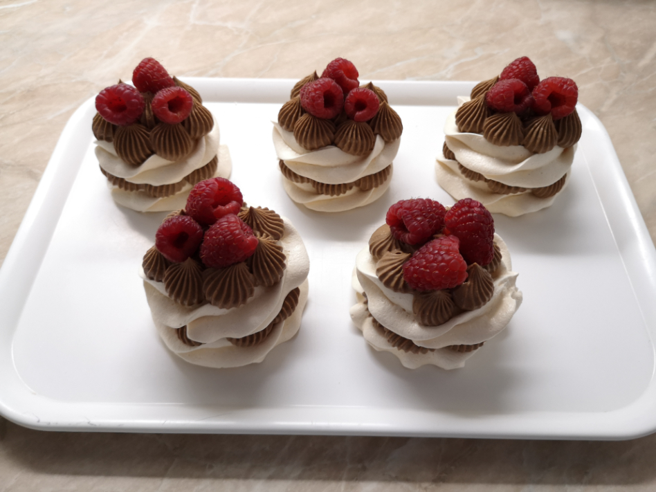 Priprema: Na beze kolutić pomoću slastičarske vrećice sa zvjezdastim nastavkom staviti kremu, pa voće, te još jedan sloj bezea, kreme i voća. Prošarati tortice na pari otopljenom čokoladom s uljem.