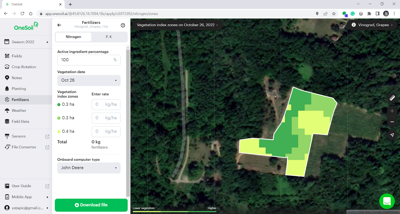 Riječ je o besplatnoj aplikaciji za daljinsko promatranje razvoja usjeva, praćenje vremena i dodavanje bilješki. U web verziji je moguće pregledavati datoteke sa strojeva i izračunavati količine sjemena i gnojiva, baš kao i na mobilnoj aplikaciji. I u drugom smjeru Onesoil omogućuje preuzimanje zona u različitim formatima u ovisnosti od mehanizacije s kojom raspolažete.