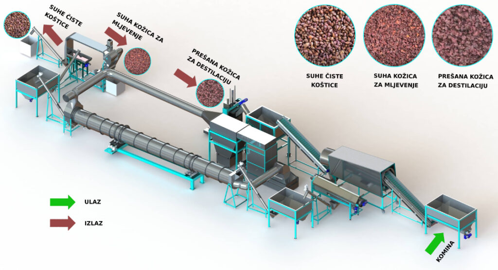 Na liniji za preradu komine u protoku se odvaja kožica od sjemenke, sjemenka se osuši na 6-8%, a dio sitnije kožice osuši se i spreman je za mljevenje u prah.