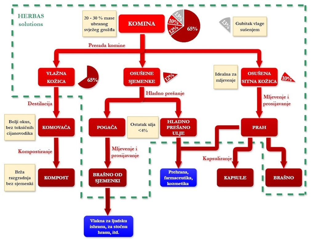 Zanimljiva je činjenica da je od komine (otpada u proizvodnji vina), moguće proizvesti visokovrijedne proizvode koji imaju potencijal donijeti i veće prihode od prodaje vina.