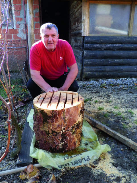 Panjeve ili trupce Mladen Šafarić iz Lopatinca donosi iz šume, a kako bi u njima za bukovače osigurao dosta vlage odnosno vode, na njima izreže kanale u koje ulijeva vodu i to je jamstvo uspjeha.