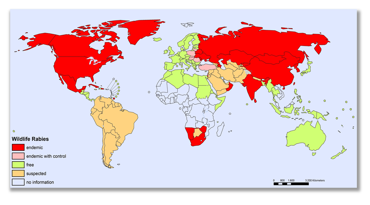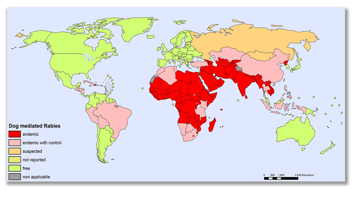 Dok se silvatična bjesnoća, koja se u prirodom ciklusu održava u populaciji divljih mesojeda, uglavnom pojavljuje na području sjeverne hemisfere, urbana bjesnoća čiji su glavni rezervoar psi ima daleko veći značaj za javno zdravstvo u zemljama u razvoju. U tim područjima bjesnoća uzrokuje do 99 % smrtnih slučajeva kod ljudi, što rezultira s više od 50.000 ljudskih žrtava godišnje. Tim oblikom bjesnoće danas su najteže su pogođene zemlje u razvoju u Aziji i Africi.