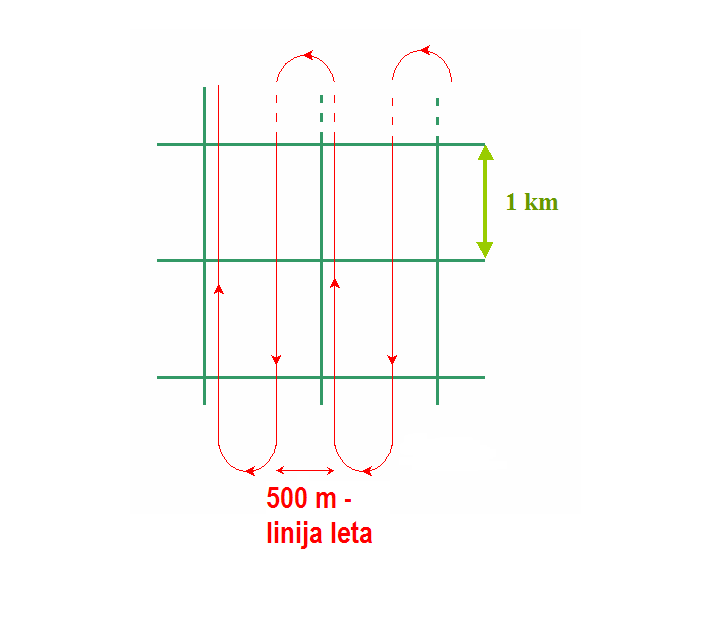 - Na jednom km2 zrakoplov napravi dvije paralelne linije leta, međusobne udaljenosti 500 m,