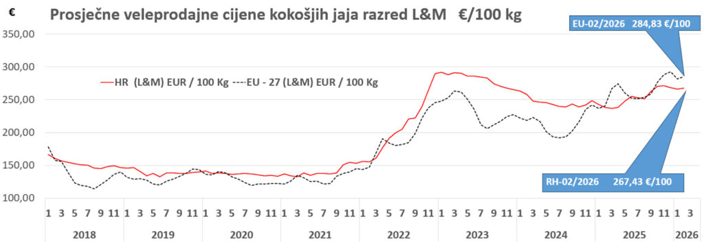 U prva dva mjeseca ove godine veleprodajne cijene pilećih trupova (65 % pile) zadržale su stabilnost te se nisu značajnije mijenjale u odnosu na razinu s kraja 2025. godine. Kretale su se u rasponu od 250 do 260 €/100 kg. Na domaćem tržištu veleprodajne cijene pilećih prsa, bataka i zabataka u veljači neznatno su niže nego u siječnju ove godine. Cijene pilećih prsa i zabataka više su nego lani. Prosječna veleprodajne cijena pilećih prsa na domaćem tržištu u veljači je iznosila 6,61€/kg i u posljednjih tri godine one se nisu značajnije mijenjale. Do porasta cijena pilećeg mesa došlo je nakon lipnja 2022. godine.