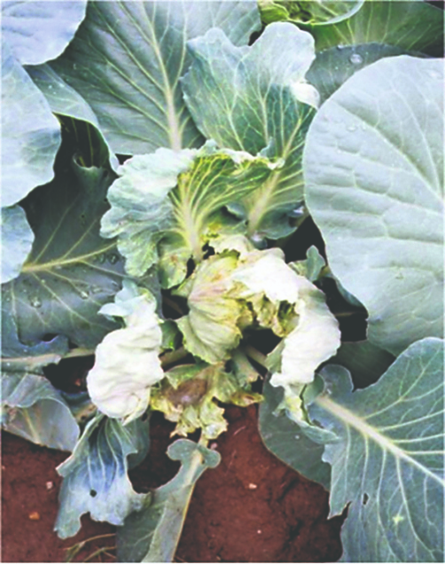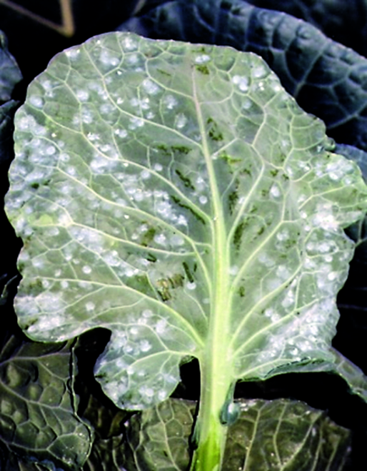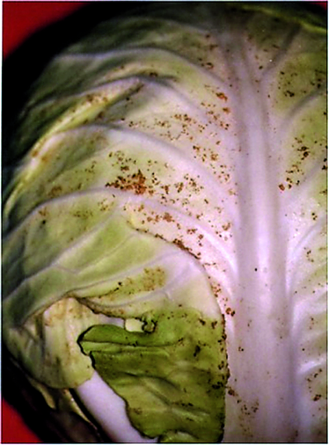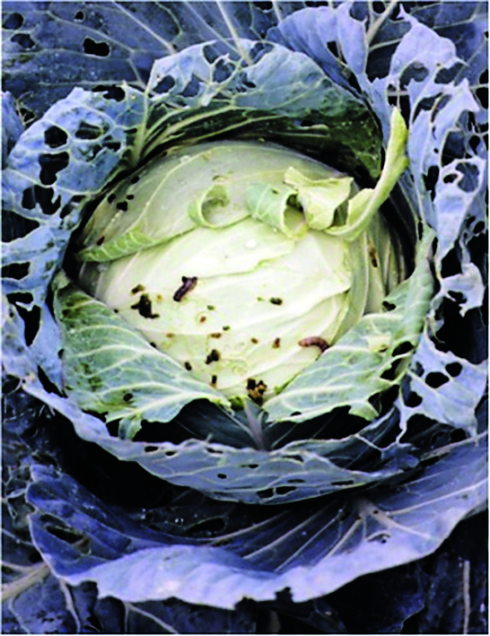 Osim sveprisutnih uši i gusjenica (na slikama 1 i 2) od početka novog milenija pri uzgoju povrtnih kupusnjača sve češće srećemo kupusni štitasti moljac ili “bijelu mušicu” (na slici 3) i štete od poljskog resičara ili tripsa (izgled šteta nakon berbe na glavici zelja – slika 4). Snimio M.Šubić