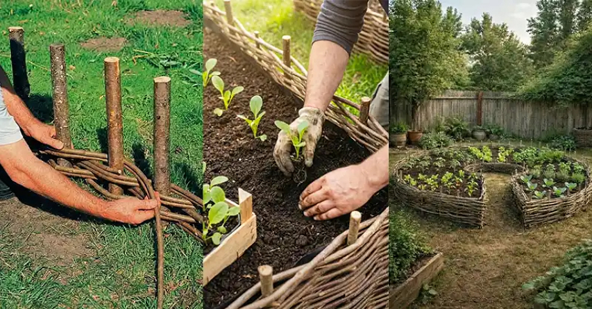 - Postupak: Zabijte kolce u zemlju u željenom obliku (krug, val, pravokutnik). Zatim vodoravno “pletite” grane oko kolaca, baš kao što se plete košara.