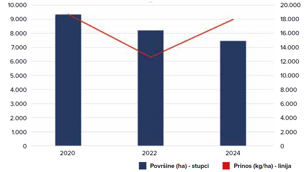 Ipak, podaci za 2024. godinu i projekcije za 2025. ulijevaju oprezan optimizam. Stabilizacija proizvodnje na 133.860 tona uz rast prinosa na 17.967 kg/ha sugerira da su na tržištu opstali tehnološki najnapredniji proizvođači. Povećanje prinosa ukazuje na nužan zaokret prema intenzivnim agrotehničkim mjerama i sustavima navodnjavanja, bez kojih je proizvodnja u uvjetima toplinskih šokova (iznad 30 °C) neodrživa.