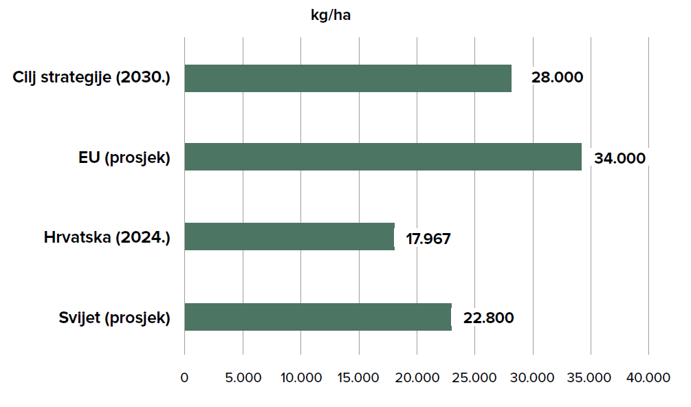 Podaci ukazuju na kontinuiran i značajan jaz u produktivnosti (tablica 2). Dok prosjek EU-27 ostaje stabilan i visok, hrvatski prinosi snažno fluktuiraju ovisno o meteorološkim prilikama. Razlika u prinosu najčešće proizlazi iz nemogućnosti domaćih proizvođača da prebrode sušne godine (poput 2022.), dok visokotehnološka poljoprivreda u ostatku EU taj rizik minimizira. Hrvatska ostvaruje tek 52,8% prinosa koji ostvaruje prosječni proizvođač u EU. To ukazuje na to da RH ne zaostaje samo u površinama, već primarno u tehnologiji i intenzitetu uzgoja. S obzirom na utvrđeni jaz u produktivnosti između nacionalne proizvodnje (17.967 kg/ha) i prosjeka Europske unije (34.000 kg/ha), nužan je prijelaz s ekstenzivnih na intenzivne sustave uzgoja.