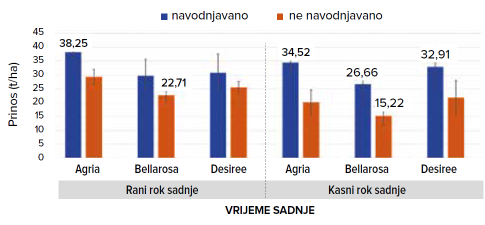 Interakcija sorte i roka sadnje: izbor sorte mora biti usklađen s rokom sadnje. Rane sorte brzim razvojnim ciklusom izbjegavaju vrhunac suše, dok kasne sorte (npr. Agria) zahtijevaju precizno planiranje. Prema rezultatima prikazanim na Grafikonu 3, sorta Agria ostvaruje najviši prinos u oba roka sadnje uz osigurano navodnjavanje, ali istovremeno bilježi najveći relativni pad prinosa u kasnoj sadnji bez navodnjavanja (sa 34,52 t/ha na 20,1 t/ha).