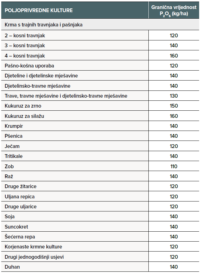 Granične vrijednosti unosa fosfora u tlo, prema potrebama poljoprivrednih kultura*