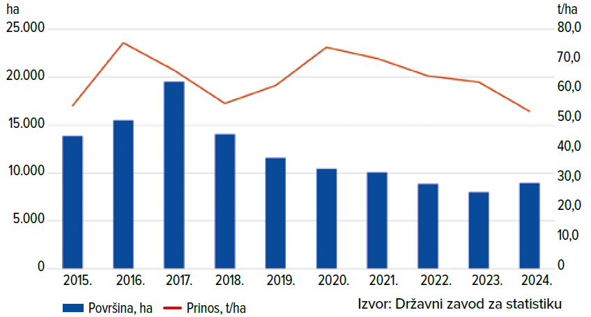 Graf. 1. Površine i prinosi šećerne repe u Hrvatskoj (2015. – 2024. godine)