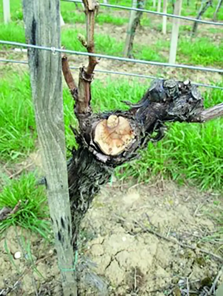 Mjesta reza promjera većeg od 2 cm uz višegodišnje drvo (slika 1) najčešće pogoduju skrivenim zarazama trsja uzročnicima eske (apopleksije). Tek naknadno za najtoplijeg dijela godine (sredinom i krajem srpnja) vidimo tipične neželjene promjene na inficiranom trsju (eska – slika 2), a prema simptomu tigrove šare (slika 3) znamo da su ovu bolest u mediteranskom području poznavale stare civilizacije u rimsko doba (prema povijesnim crtežima) Foto: M. Šubić