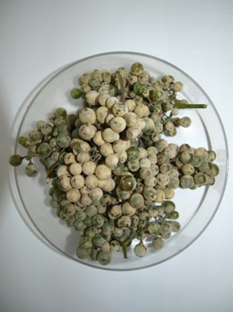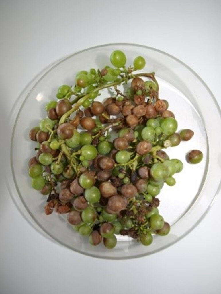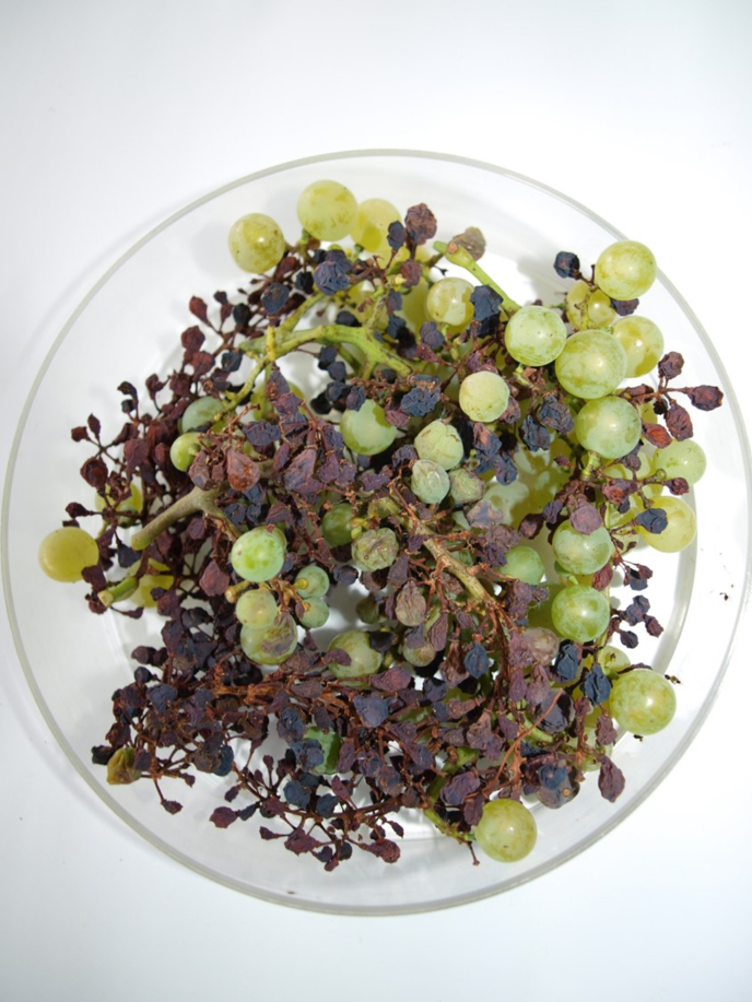 Vinovu lozu napada više od 80-ak različitih uzročnika bolesti, među kojima su najčešće (pseudo)gljivičnog podrijetla. Osim dominantnih pepelnice (oidija) i plamenjače (peronospore) zadnjih su nas desetak godina znale već tijekom i nakon cvatnje vinograda iznenaditi svojom pojavom i neke ne tako česte patološke promjene: npr. sušica cvata (Phoma), siva plijesan u cvatnji (Botritis) ili “iznenađenje” zadnjih pet godina: crna trulež grožđa (Guignardia) (vidi Sliku 4).