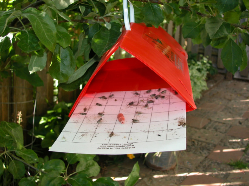 One ulaze kroz otvore, ali kasnije teško pronalaze izlaz. U zaštiti voćaka koriste se i ljepljive ploče. Bijele ljepljive ploče smanjuju napad osica, dok žute ljepljive ploče smanjuju napad lisnih uši, trešnjine muhe, maslinove muhe i drugih letećih štetnika. Bijele ploče treba postavljati na sunčanim mjestima jer djeluju na temelju refleksije svjetlosti i bijele boje. Jedna od vrlo učinkovitih ekoloških metoda zaštite voćaka je korištenje feromona. Feromoni su kemijske tvari koje insekti prirodno izlučuju kako bi privukli jedinke suprotnog spola tijekom razmnožavanja. U voćnjacima se koriste umjetno proizvedeni feromoni koji se postavljaju u različite vrste klopki ili dispenzera. Feromonske klopke mogu služiti za smanjenje broja štetnika, jer privlače mužjake koji zatim ostaju uhvaćeni u klopci.
