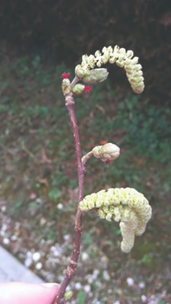 Jednogodišnji izbojak lijeske na kojem se vrlo jasno vide muški cvatovi (rese) i ženski cvatovi (prepoznaju se po razrasloj crvenoj njušci tučka).