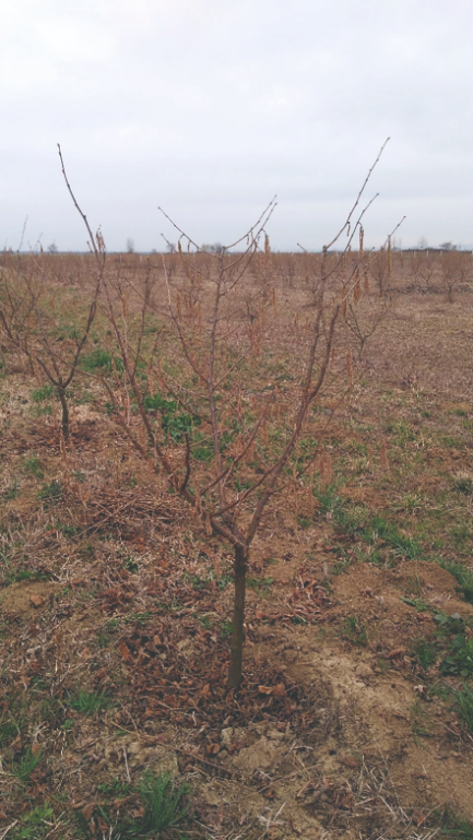Formirani uzgojni oblik vaze na stablu kod sorte ‘Rimski’ u nasadu lijeske pokraj Nove Gradiške, Rešetari. U ovo slučaju vidljiv je pre mali vertikalni razmak između primarnih grana.