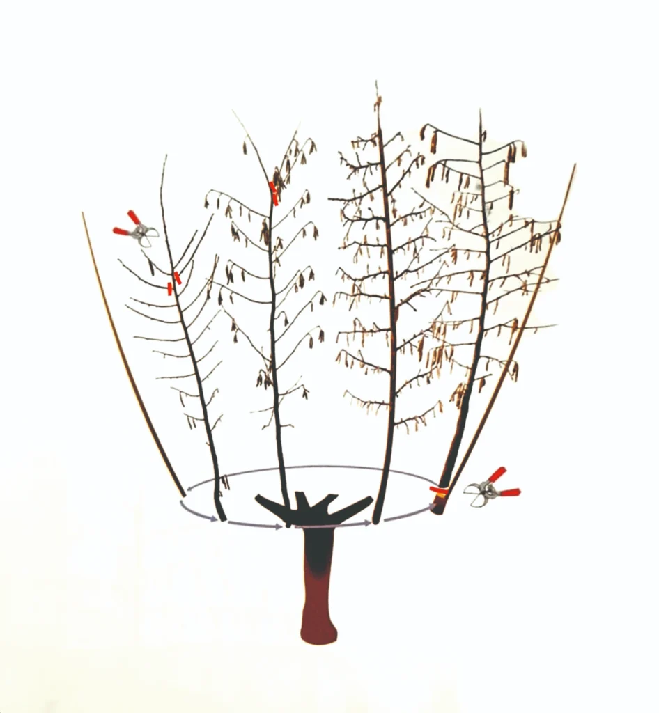 Crtež 3. Prikaz cikličke izmjene primarne grane (otprilike u 5. godini starosti) rezom prorjeđivanja kod lijeske. Kao što je vidljivo na skici prije same izmjene dobro je pripremiti rezervnu primarnu granu kako bi što prije počela roditi. Osim toga vidljivo je i pri vrhovima drugih primarnih grana uklanjanje suviše bujnih lateralnih izbojaka, što će navedene primarne grane prenijeti u rodne. Skicirano prema  knjizi „Gajenja lijeska“ (2023) autori, Mičić, Đurić i Pašalić