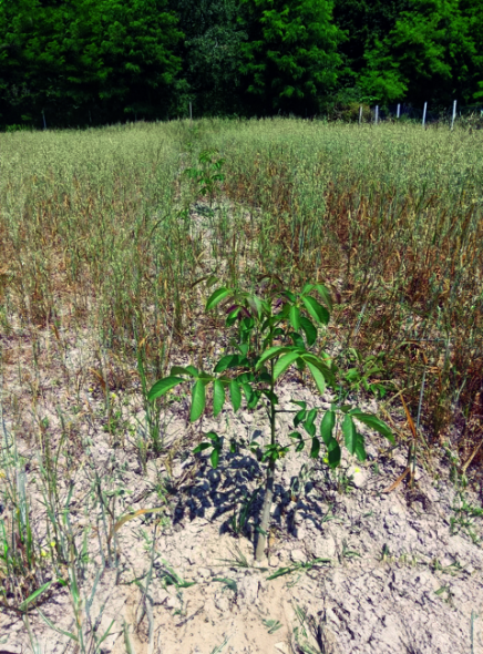 Prikaz čepiranih sadnica oraha: 3a – nakon provedenog čepiranja; 3b – u lipnju nakon uklanjanja rezervnog izbojka; 3c – krajem kolovoza