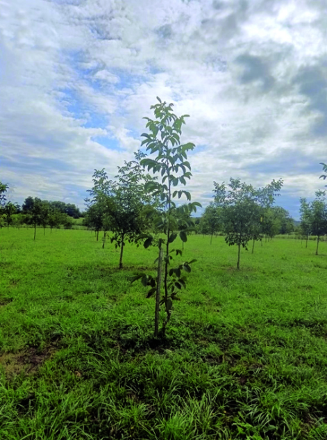 Sustav uzgoja oraha u obliku žive ograde moguće je ostvariti s lateralnim sortama s manjim razmakom sadnje (npr. 5,5 x 7 m, 6 x 8 m itd.). Za navedeni sustav uzgoja može se koristiti popravljena piramida i kosa palmeta, ili oblikovati uzgojni oblik kako je dalje navedeno (Slika 7).