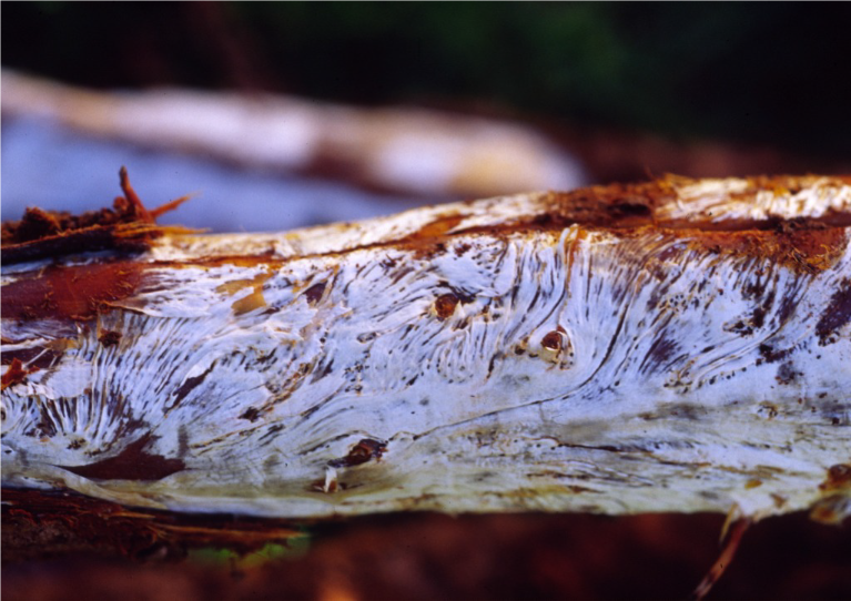 Slika 4. Armillaria – bijeli micelij („lepeze“) ispod kore zaraženog korijena (Izvor: https://agriculture.vic.gov.au)