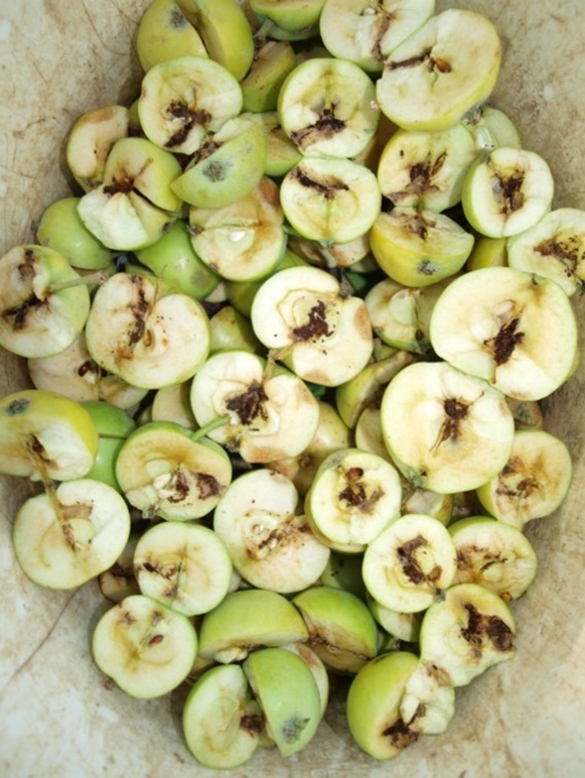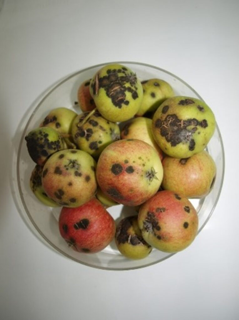 Na slikama 3 i 4 je najčešća bolest na jabukama i kruškama, koje tijekom kišnog proljeća i sparnog ljeta na netretiranim stablima uzrokuju prijevremeno otpadanje lišća već u prvoj polovici rujna (na jabukama – slika 3 i zaraza na plodovima – slika 4). Gotovo da nema voćne vrste koju ne napada neka vrsta “crvljivosti” plodova (npr. gusjenice savijača, pagusjenice voćnih osica, ličinke kornjaša – voćnih pipa i ličinke voćnih muha ili octene mušice pjegavih krila). Uzročnici “crvljivosti” plodova su tehnološki štetnici koji ne uzrokuju propadanje (sušenje) voćaka, pa do određene mjere mogu biti podnošljivi. Uz okućnice njihov kritični prag je manje naglašen, jer se “crvljivi” plodovi (slika 5) mogu očistiti i koristiti u preradi (npr. za kompot, pekmez i slično). Snimio M.Šubić
