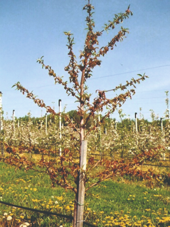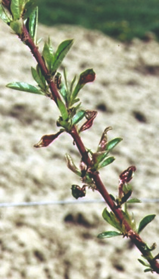 Prvi simptomi kovrčavosti lišća bresaka i nektarina (Taphrina) postaju vidljivi približno 14 dana nakon pojave zelenog vrha iz pupova (slika 1), krajem travnja inficirano lišće mijenja oblik (postaje nakovrčano, mjehurasto, zadebljano i hipertrofirano – slika 2). Netretirano stablo breskve zaraženo uzročnikom kovrčavosti krajem travnja (slika 3). Snimio M. Šubić