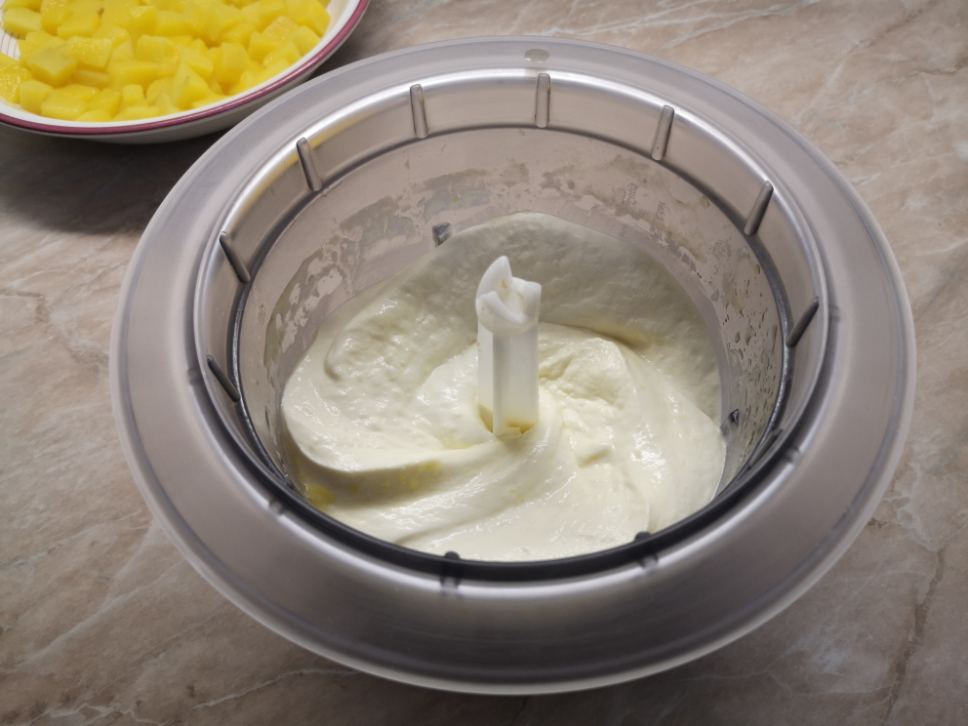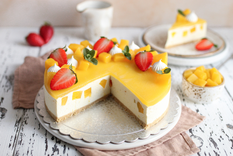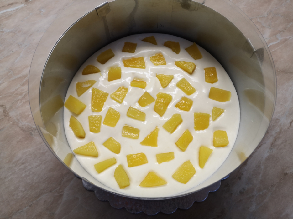 Priprema: 250 g manga usitniti u blenderu ili štapnim mikserom u pire. Dodati krem sir, tekuće vrhnje za šlag, sok od manga, šećer u prahu, vanilin šećer i sok od limuna. Miksati u blenderu u homogenu smjesu. U to dodati želatinu pripremljenu prema uputi na pakiranju. Kad nabubri, na laganoj vatri otopiti i pjenjačom umiješati u kremu. Kremu izliti po podlozi od keksa, a na nju staviti 200 g manga izrezanog na kockice, pa lagano utisnuti žlicom u kremu. Poravnati, ostaviti u hladnjaku 1 sat da se stisne, pa napraviti preljev.