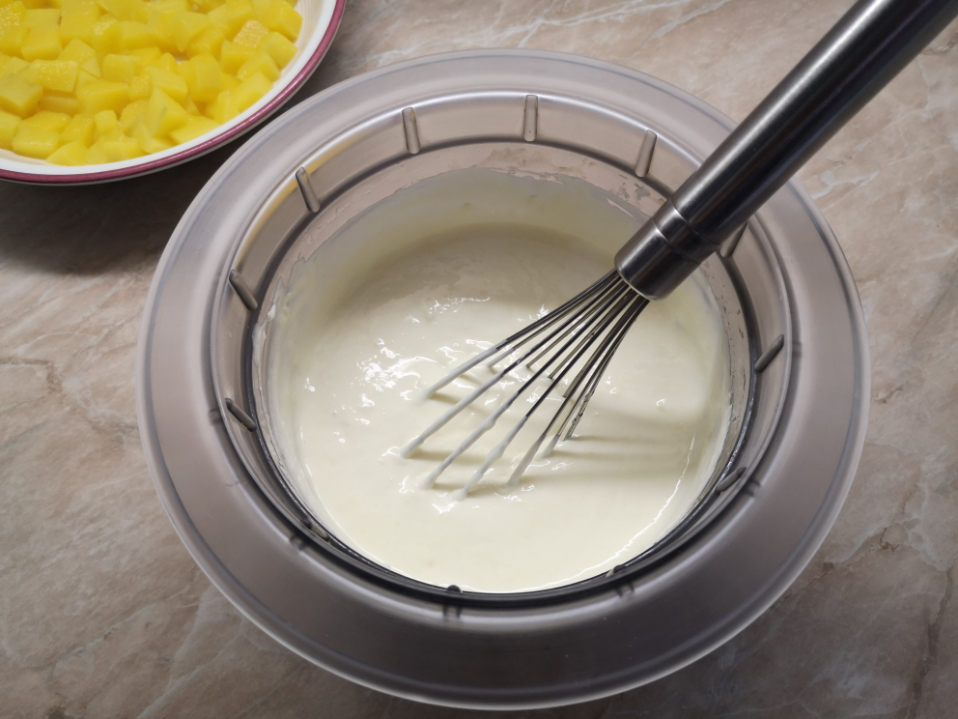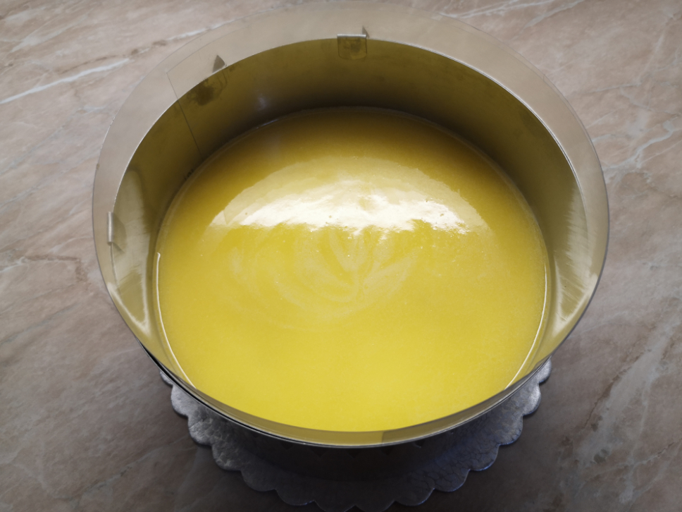 Priprema: Izblendati sok i mango sa šećerom. Želatinu namočiti sa 3 žlice vode, pustiti da nabubri, pa otopiti na laganoj vatri, te dodati u preljev. Preljev dobro promiješati, pa ga preliti po kremi. Staviti u hladnjak da se stisne barem 1 sat. Ukrasiti po želji.