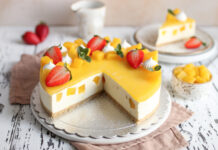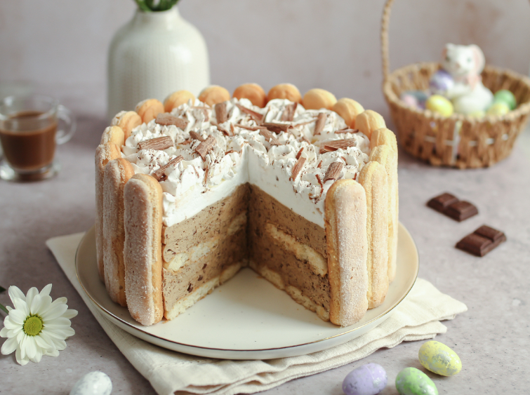 Priprema: Na ukrasni tanjur staviti podesivi okvir za torte promjera 26 cm. Piškote kratko močiti u mješavinu mlijeka i arome ruma sa stranom bez šećera. Slagati ih okomito po rubu kalupa sa šećernom stranom prema van. Na dno slagati piškote močene s obje strane. Rasporediti pola količine kreme i poravnati. Na kremu složiti još jedan red močenih piškota, pa ostatak kreme. Staviti u hladnjak na nekoliko sati, najbolje preko noći. Maknuti okvir s torte i ukrasiti umućenim vrhnjem za šlag i ribanom čokoladom.