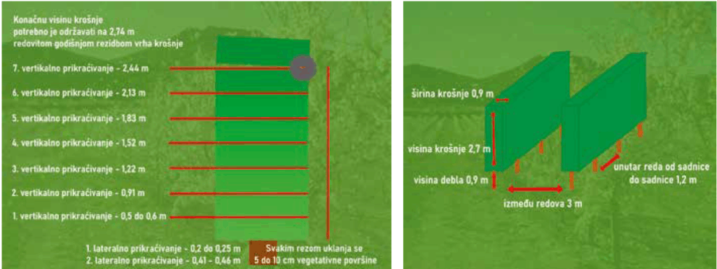 Kako bi se što prije formirala krošnja u obliku žive ograde uzgajivači obično sade od „Agromillora Group“ posebne sadnice tzv. „Smarttree“ – koje karakterizira visina od 45 do 60 cm, bez centralne provodnice ali sa lateralnim razgranjenjem. Navedeno rasadničari postižu višestrukim prikraćivanjem sadnice na 40-46 cm visine. Ekvivalent tome bi bile „knip sadnice“ kod jabuka, osim što one imaju provodnicu. Takve sadnice se sade u voćnjak s bambusovim štapom visine 1,2 m te nikakva dodatna armatura ili žice nisu potrebne. Prvih nekoliko godina do formiranja krošnje u obliku žive ograde potrebno je intenzivno prikraćivanje. Kako bi se razvila zadovoljavajuća visina navedene krošnje, potrebno je provesti vertikalno prikraćivanje 7 puta, svakih 30 cm rasta , što stvara nove izbojke i generativne pupove. Vertikalno prikraćivanje se radi na sljedeće visine: 0,5-0,6 m, 0,91 m, 1,22 m, 1,52 m, 1,83 m, 2,13 m i zadnje na 2,44 m.